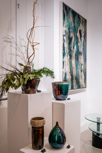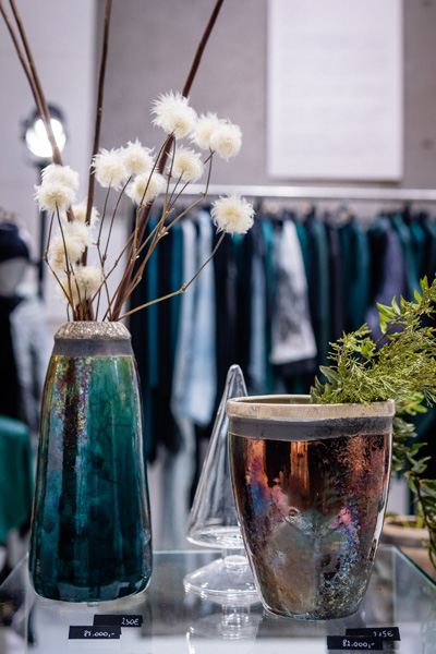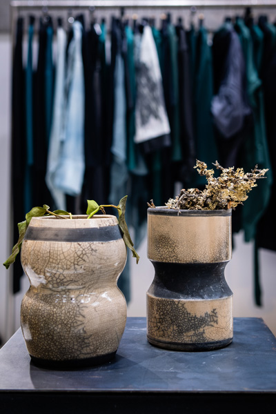 Soltész Ágnes munkái ebben a közegben különösen hangsúlyosan érvényesültek. A raku kerámiák felületén megjelenő repedések, rétegek és finom elszíneződések a természetes folyamatok nyomait hordozzák magukon – olyan értékeket, amelyek szorosan kapcsolódnak a NUBU tervezői szemléletéhez. Az anyag kiszámíthatatlansága és az égetés során kialakuló egyszeri formák párbeszédbe léptek a kollekció strukturált textíliáival, megerősítve a limitált, megismételhetetlen alkotás gondolatát.